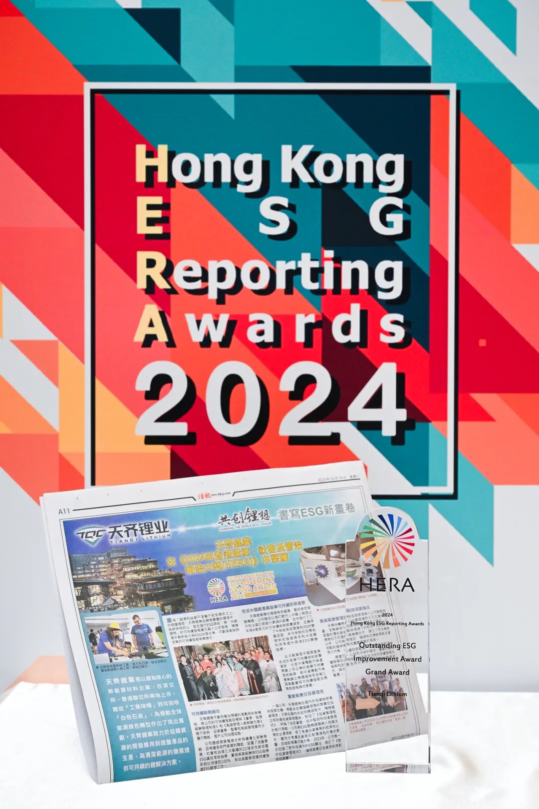 天皆锂业荣获2024香港ESG诠释大奖(HERA)之“隆起ESG跳跃奖”(Outstanding ESG Improvement Award),以犒赏公司在环境、社会及照应(ESG)领域取得的显耀进展,进一步彰显了天皆在推动可不竭发展和绿色转型方面的坚硬痛快。