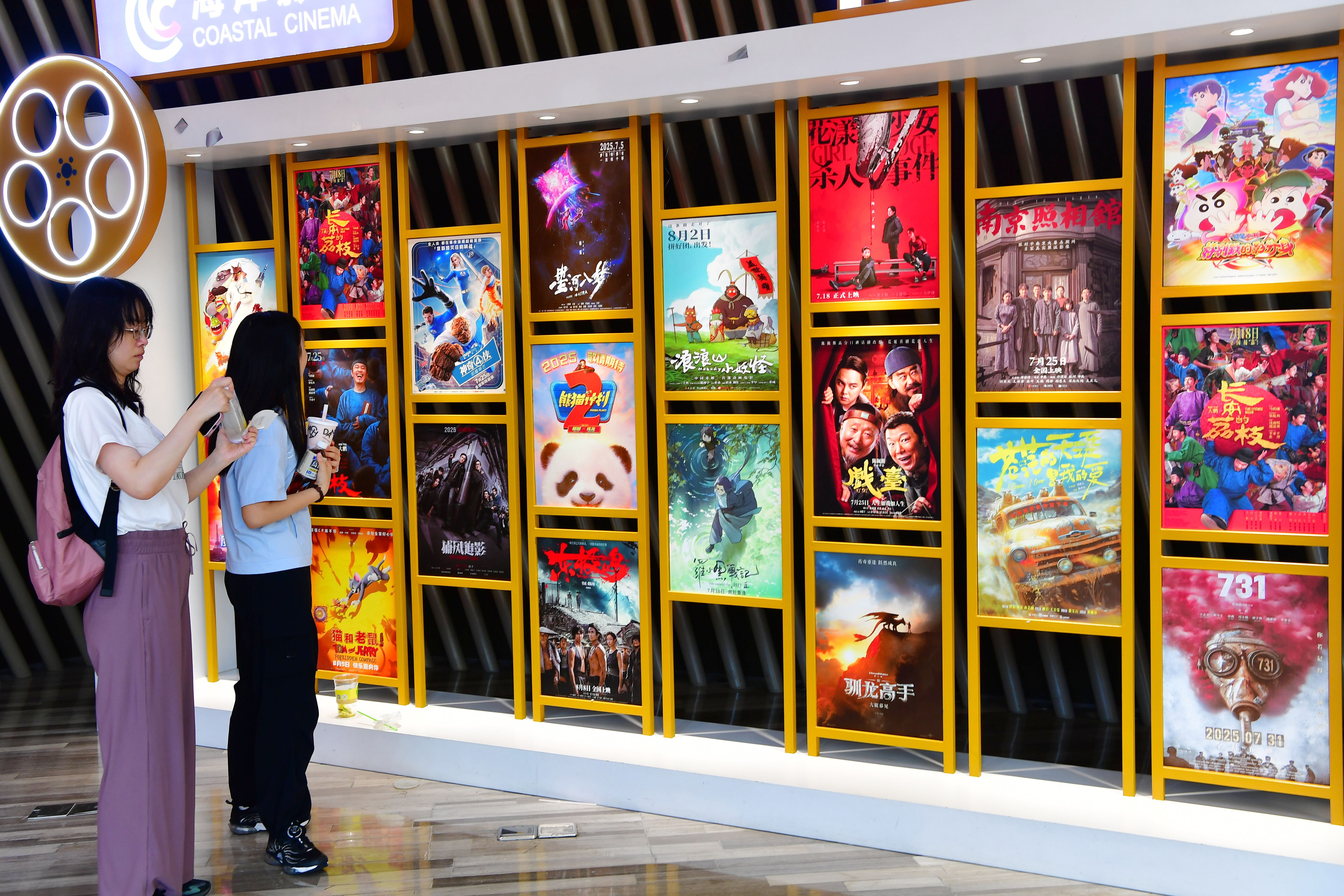 8月17日,不雅众在江苏省无锡市一家影城的电影海报前立足。新华社发(还月亮摄)