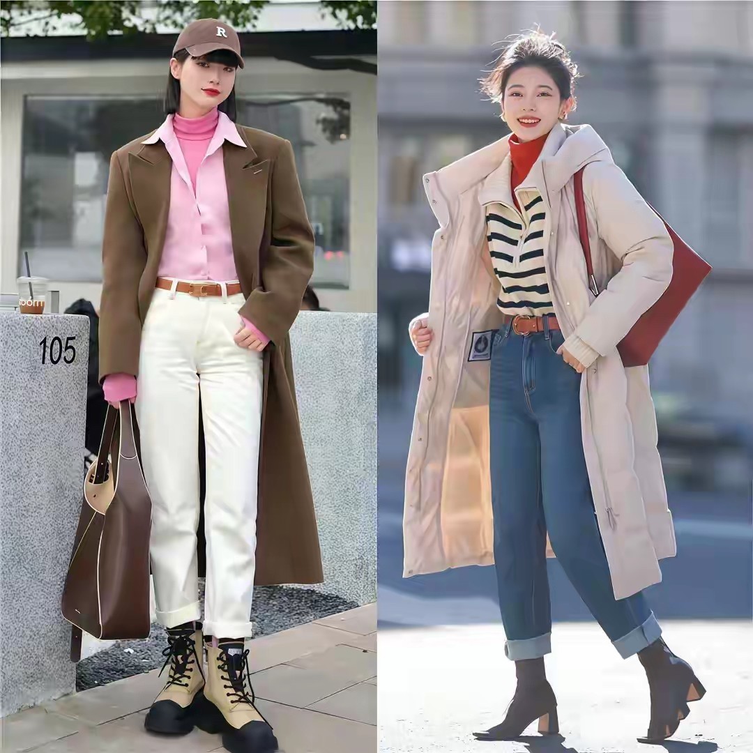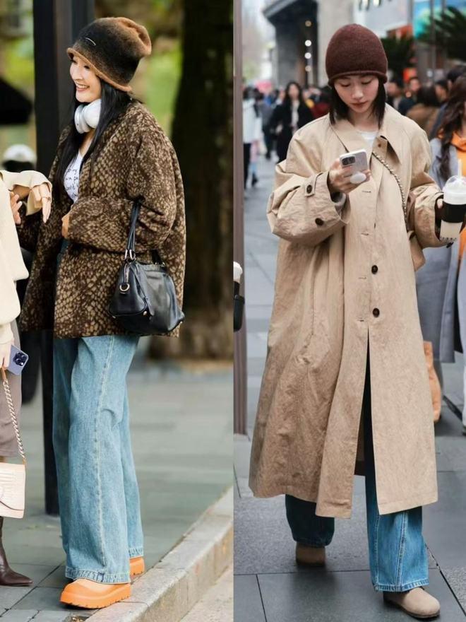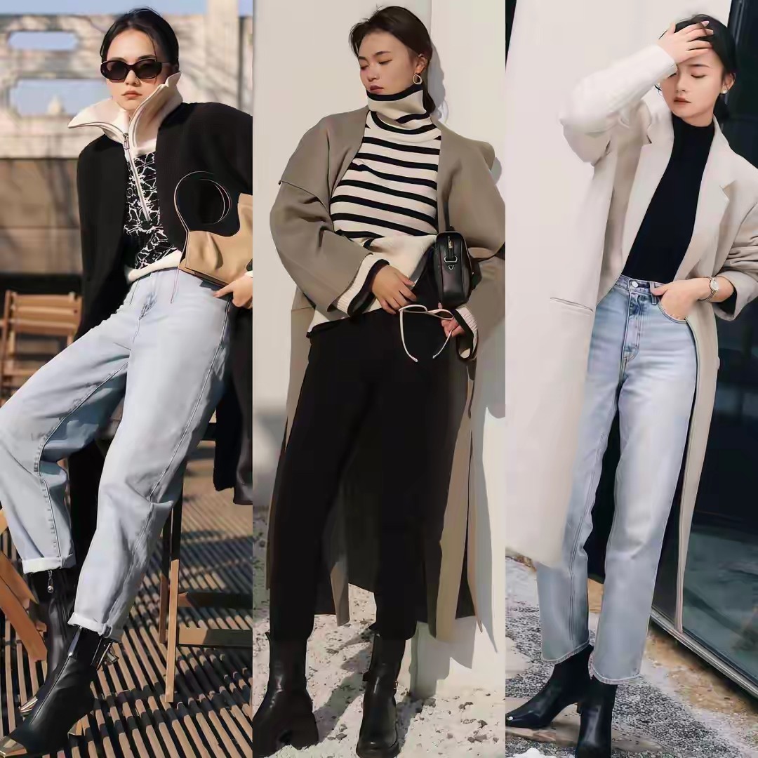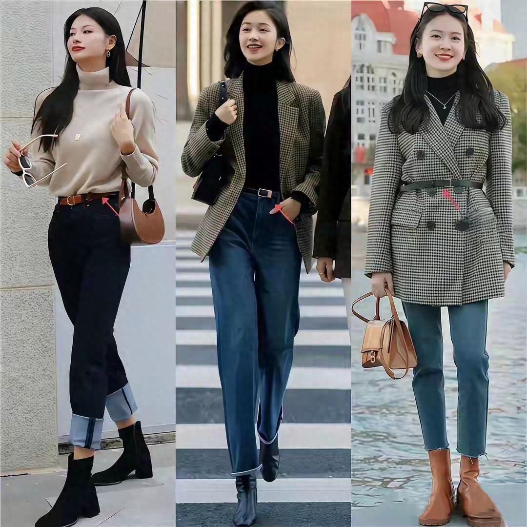 就好比如上头这三位前锋达东说念主的穿搭,用一条牛仔9分裤搭配一对短靴,加上大外衣内搭诚挚毛衣,御寒又舒坦。