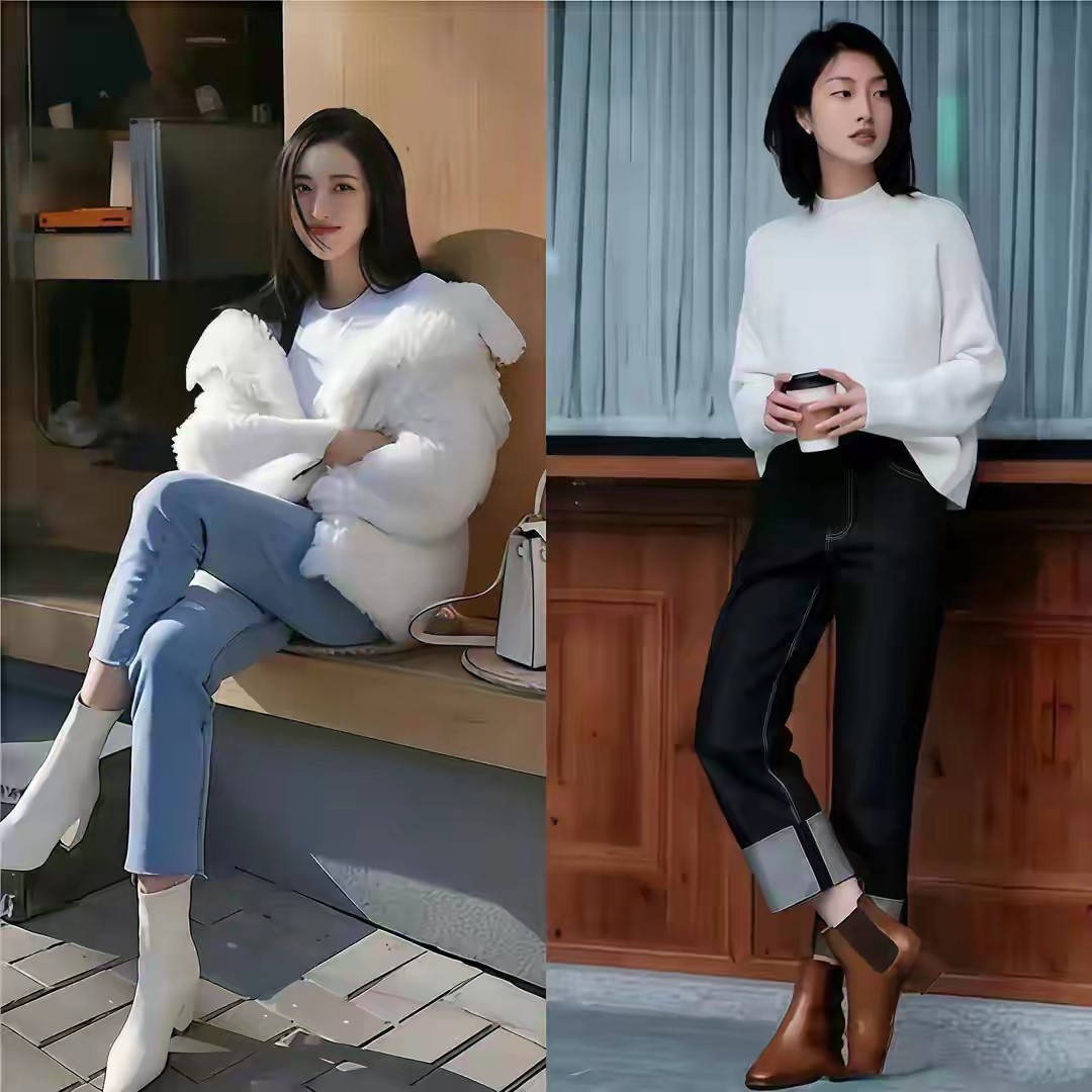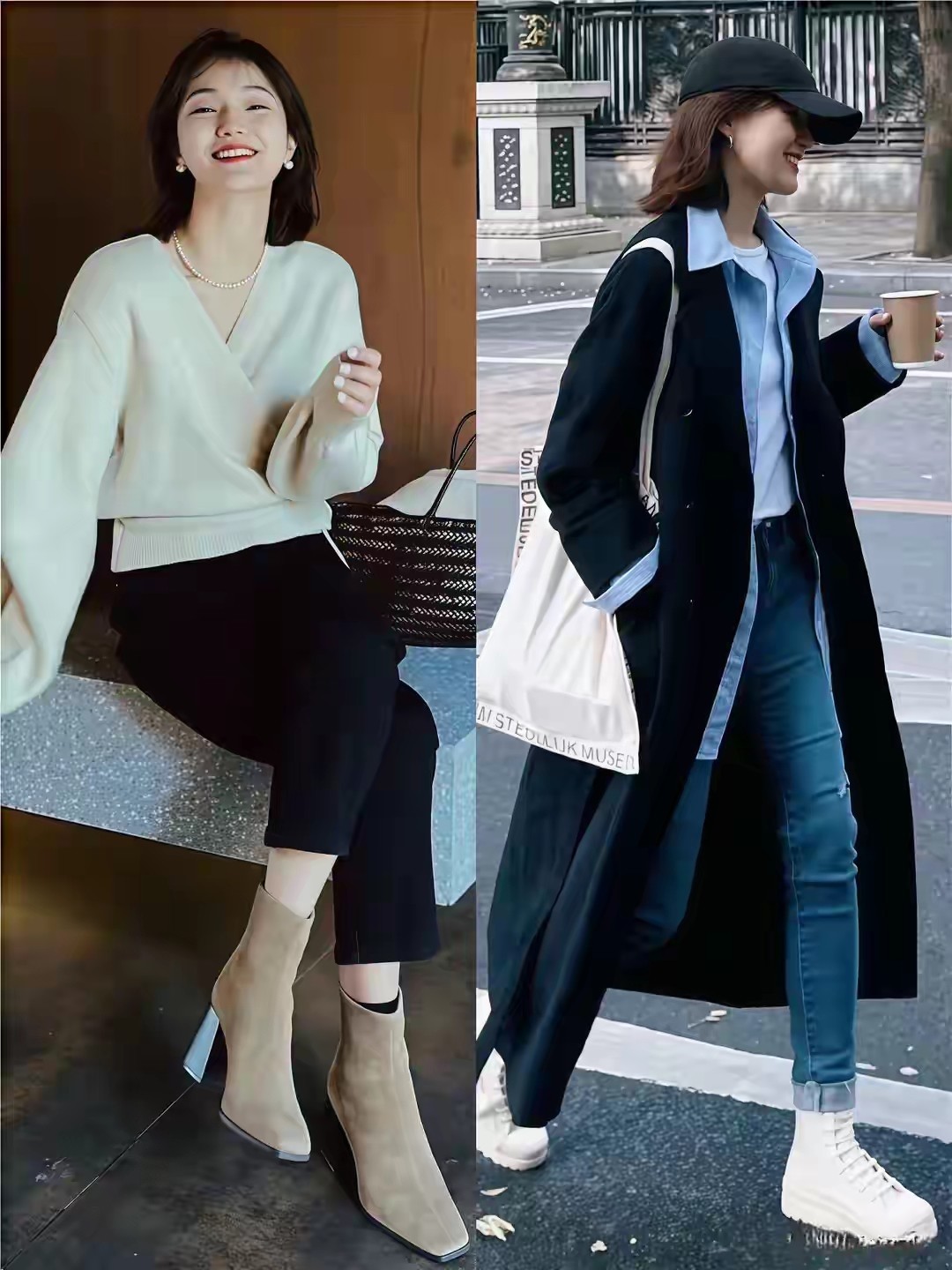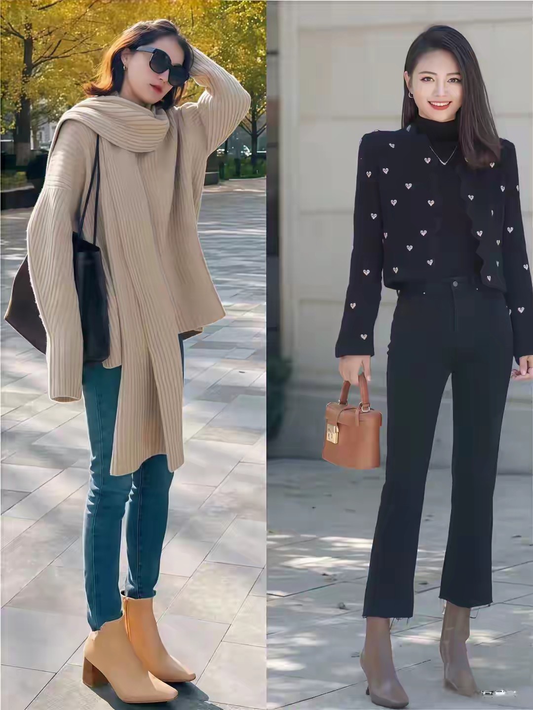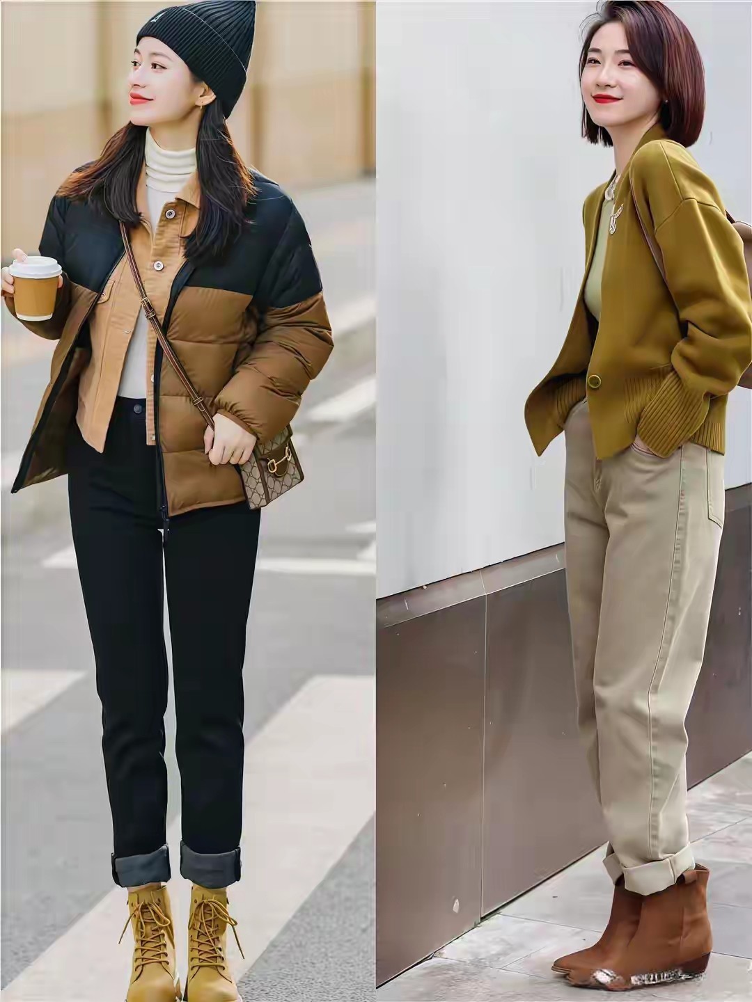 就好比如上头这三位前锋达东说念主的穿搭,用一条牛仔9分裤搭配一对短靴,加上大外衣内搭诚挚毛衣,御寒又舒坦。