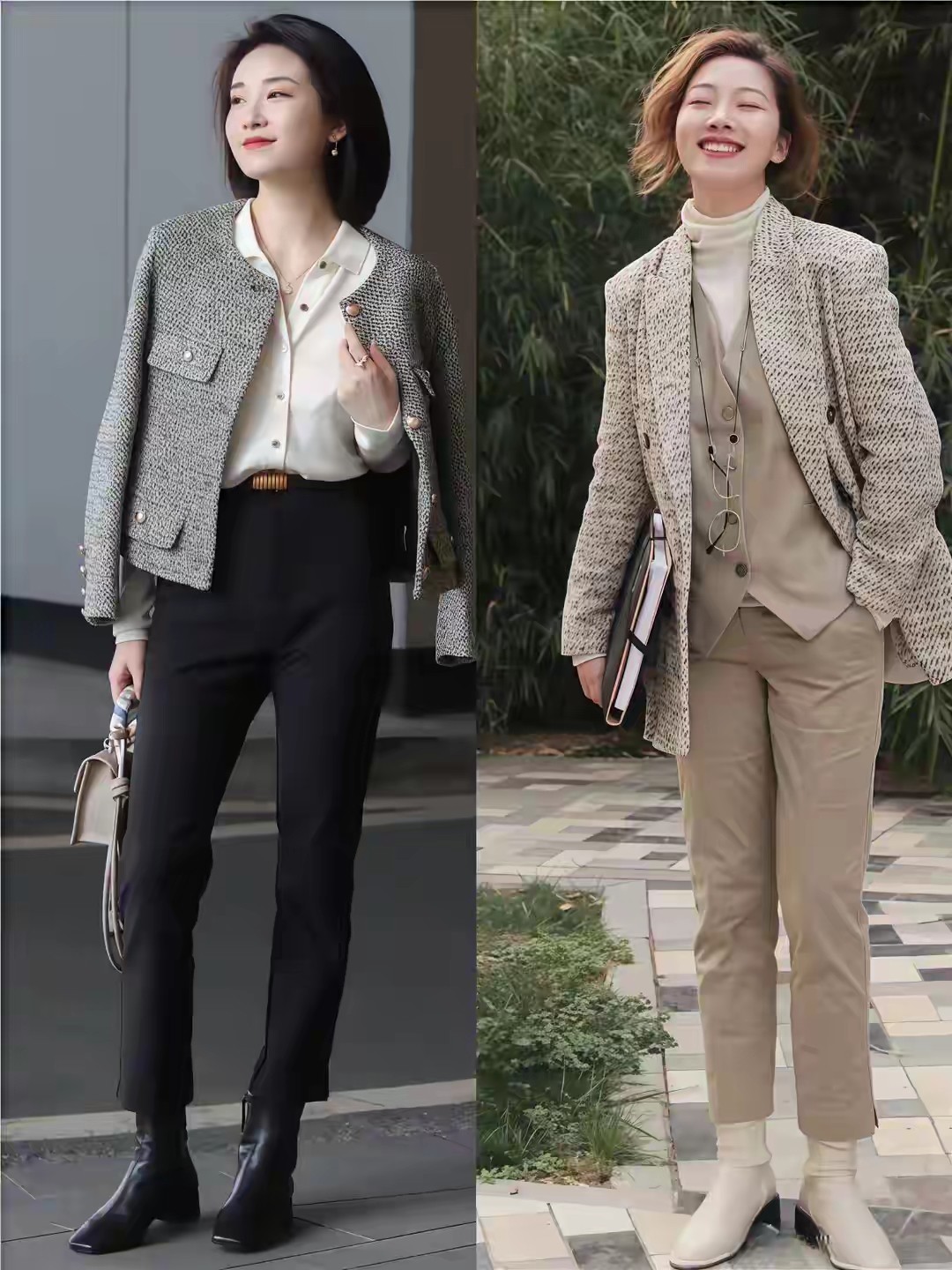 还不如径直采选相比经典,挺阔有型的小香风外衣来穿搭,这么还能酿成上短下长的搭配,或者采选一件翻领的西装外衣来搭配卡其色的9分裤,这么会更通勤文雅。