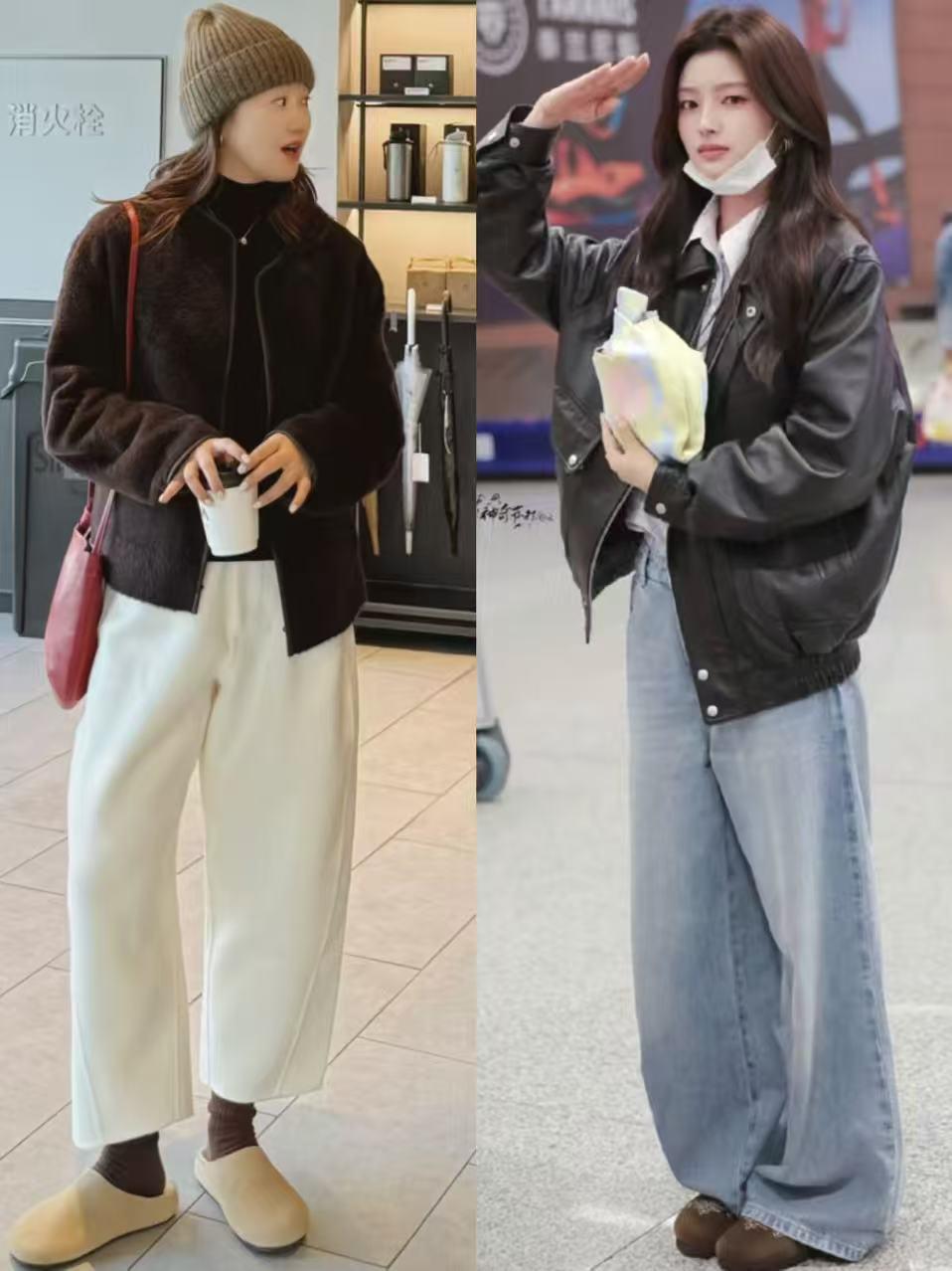 像上头这两位前锋达东说念主,还用一件棉服来组合短款的棉服和阔腿裤搭配,酿成上短下长的搭配手段,这么相等合适小个子女性模仿。