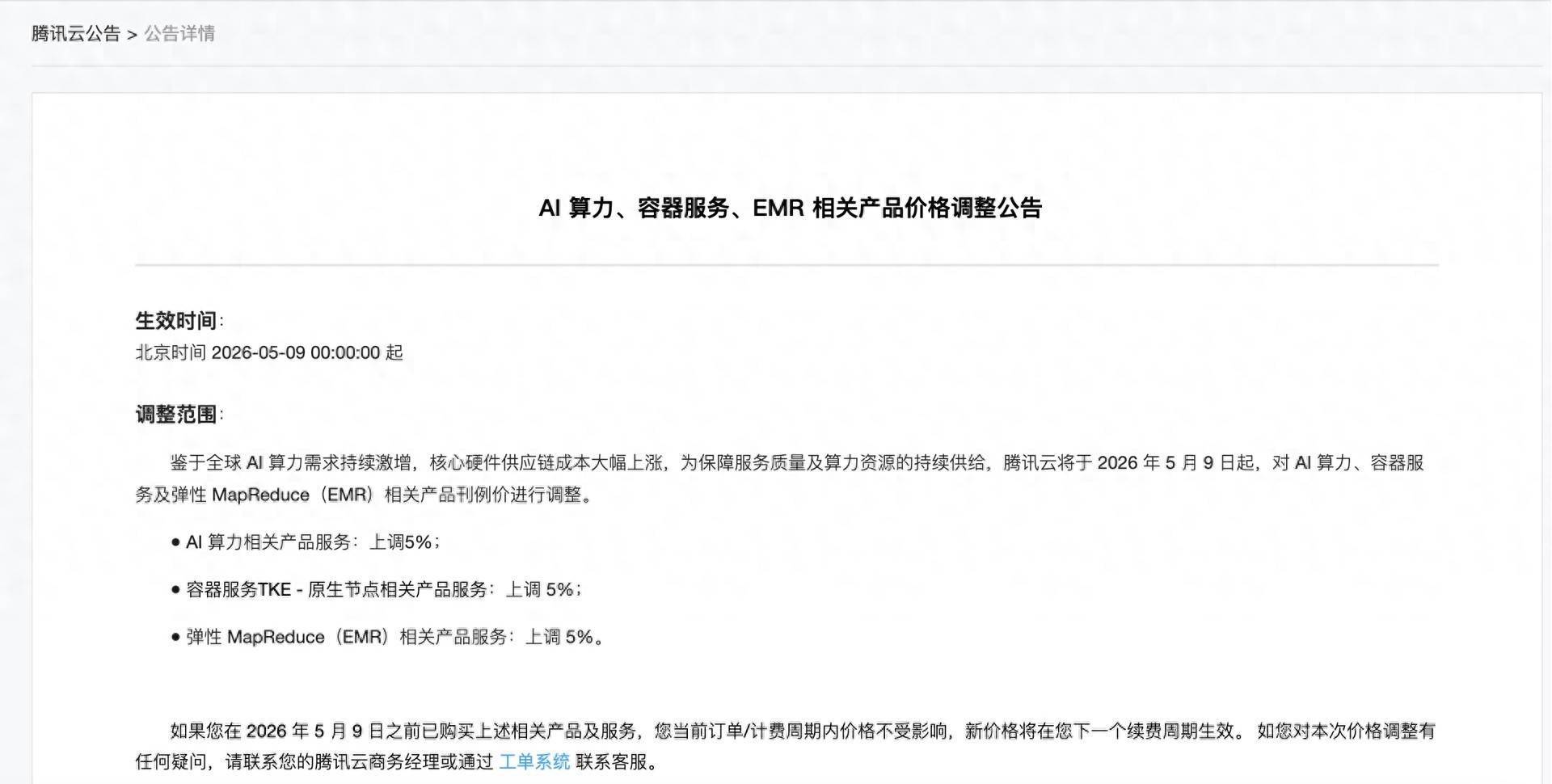 4月9日,腾讯云发布公告,自2026年5月9日起,对AI算力、容器事业TKE-原生节点、弹性MapReduce(EMR,一种大数据分析器用)三类产物价钱和谐上调5%。已购买事业的用户,在刻下计费周期内不受影响。
