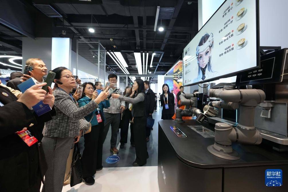 r10月14日,嘉宾在北京经开区机器东谈主大寰宇不雅看咖啡机器东谈主演示。